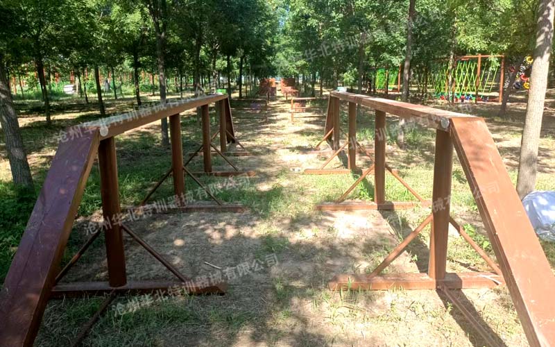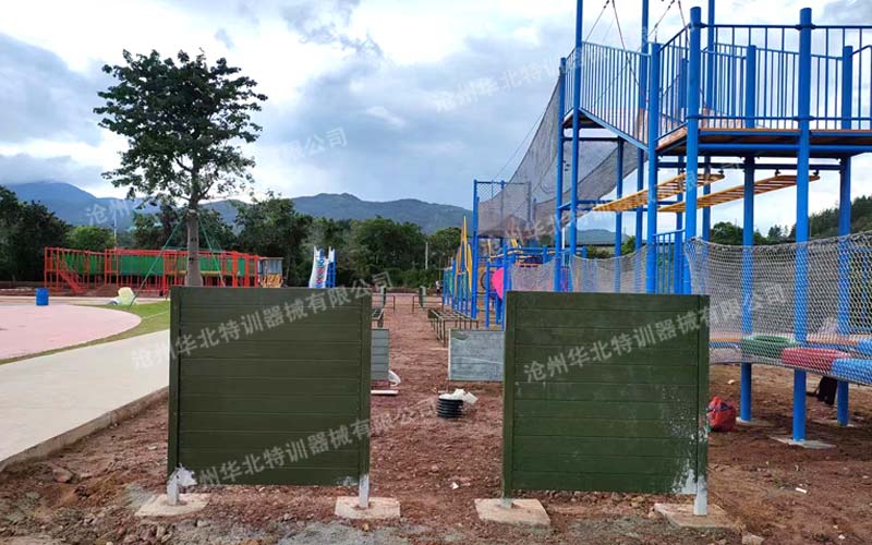 兒童國(guó)防軍事障礙單道場(chǎng)地長(zhǎng)50米,寬2米。通常為雙道并列設(shè)置。項(xiàng)目依次為獨(dú)木橋、高欄、斜坡、地籠、矮墻、高板6個(gè)項(xiàng)目。