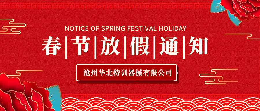 尊敬的新老客戶: 歲序更替,華章日新。華北特訓全體員工在此深深感謝大家長期以來對我司的支持與厚愛!向大家致以最誠摯的問候和最美好的祝福! 結合我司的實際狀況,公司春節放假時間具體安排如下: 春節放假時間:2022年01月24日——2022年02月07日(農歷正月初七)。2月08日(...