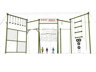 器械整體占地39.17米×19.04米×12米(高),最小場地需求42.77米×21.64米 。主要項目:合力橋、單杠、斷橋、天梯(速滑、速降)、蕩木橋、繩網