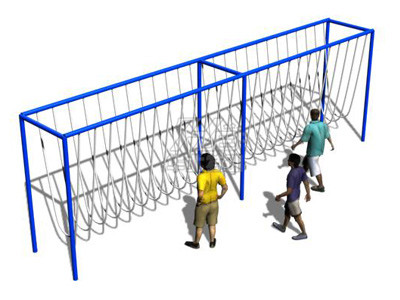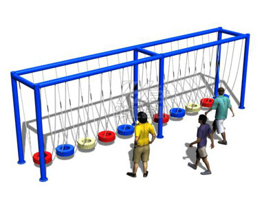 人員從吊樁一端手抓鏈條,腳踩吊樁,利用慣性通過倒換吊樁逐一通過,到達終點。