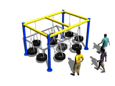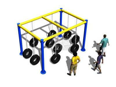 參訓人員腳踩輪胎,手借助吊繩,通過慣性移動到另一個輪胎上,到達終點。