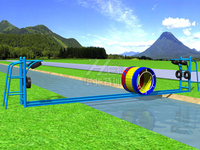 兩名隊員組合在圓筒內站立身體,雙腳不斷前移,利用重心原理把筒向前滾動