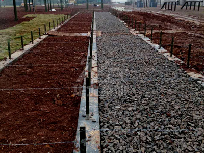 泥潭(石子)鐵樁網。分2道,每道長30米,寬2米,高0.5米。左側為泥潭鐵樁網,高0.4米,下鋪泥漿;右側為砂石鐵樁網,高0.5米,下鋪砂石
