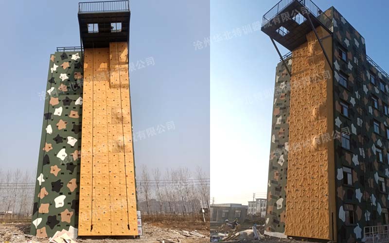 江蘇淮安某部攀登樓附屬設施順利完工!此項目主要包含攀巖墻、雨水管、避雷針、攀爬鋼梯及索降平臺。現已建設完成并投入使用。