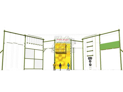 器械整體占地44.4米×20.43米×12米(高),最小場地需求44.82米×23米。主要項目:攀巖、單杠、斷橋、天梯(速滑、速降)、蕩木橋、繩網、吊索橋、相互